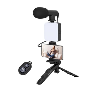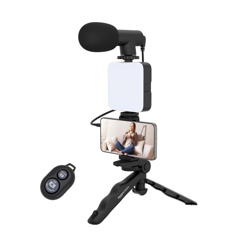Amazon Basics 6-in-1 Vlogging Kit for All Phones | Tripod, LED Video Light, Cardioid Microphone, Phone Clip, Bluetooth Remote & Microphone Cable | Useful for Live Broadcasting, Video Calling
