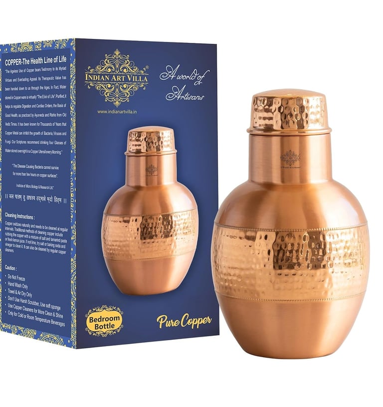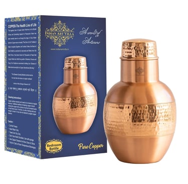 INDIAN ART VILLA Pure Copper Bedroom Bottle with Inbuilt Glass - Pear Pot Design, Half Hammered Shine Finish, 1650 ml Capacity