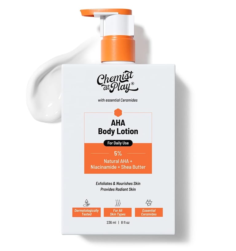 Chemist At Play AHA Body Lotion with 5% Natural AHA, Niacinamide, Shea Butter | For Exfoliating Dry & Dead Skin Cells, Deep Nourishment & Radiant Skin | Skin Brightening Lotion | 236ml