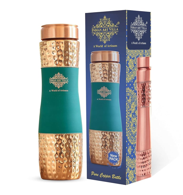 Indian Art Villa Copper Half Hammered Half Green Color in Silk Finish Champion Design Bottle, Volume- 1000 ML, 1 Pc. - Green