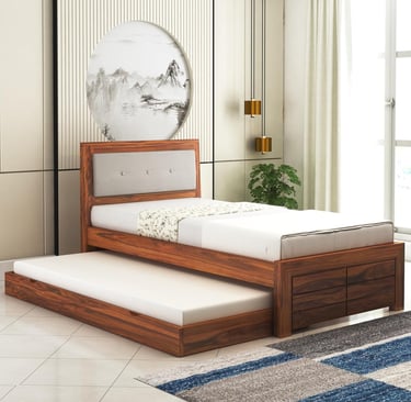 Ganpati Arts Sheesham Wood Euro Single Size Trundle Bed with 1 Extra Pullout Bed for Bedroom Living Room Hostel Home (Natural Finish)