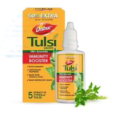 Dabur Tulsi Drops : 30ml (20ml + 10ml Free) | Contains Extracts of 5 Rare Tulsi | Boosts Immunity | Cough And Cold Relief | 100% Ayurvedic | Builds Respiratory Health
